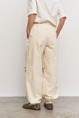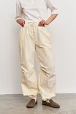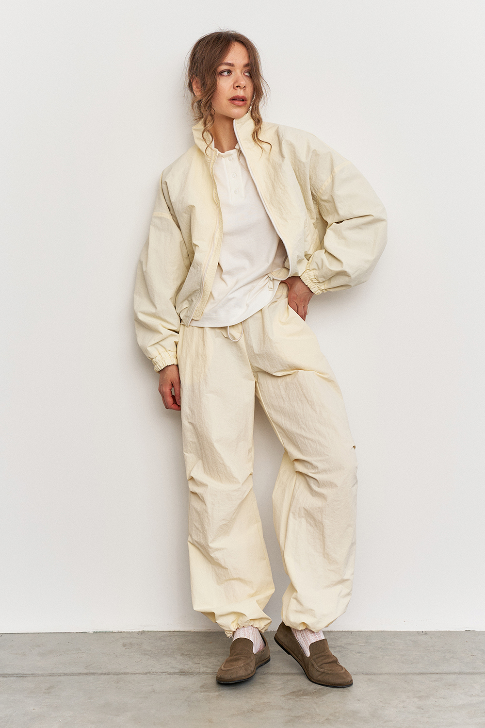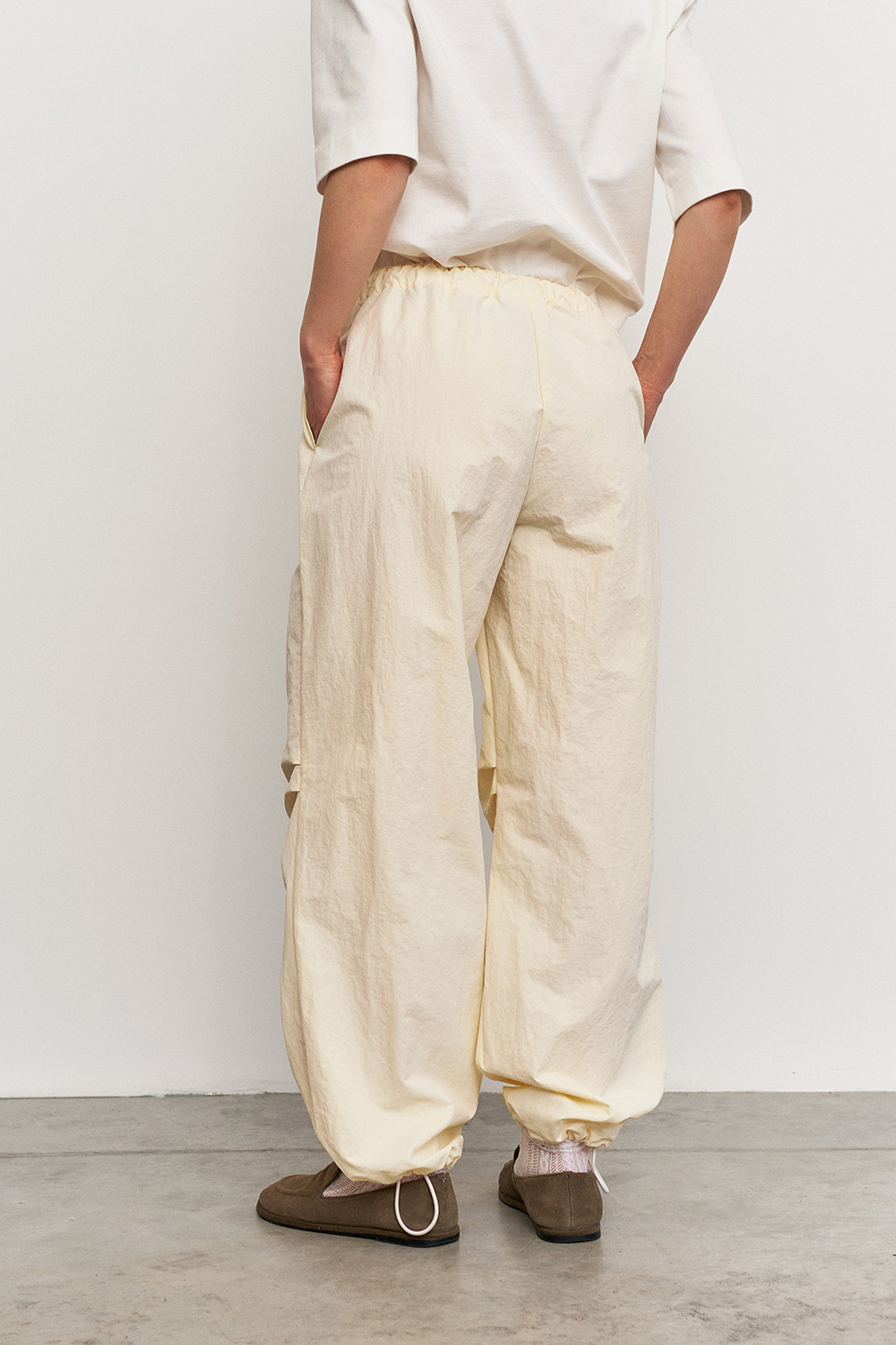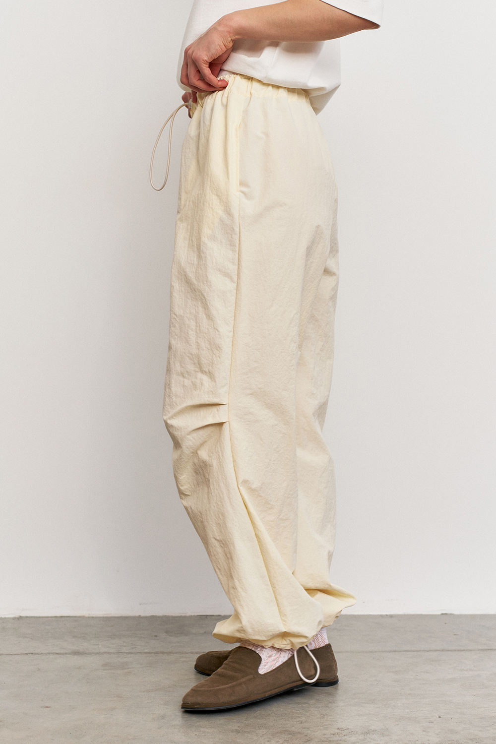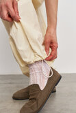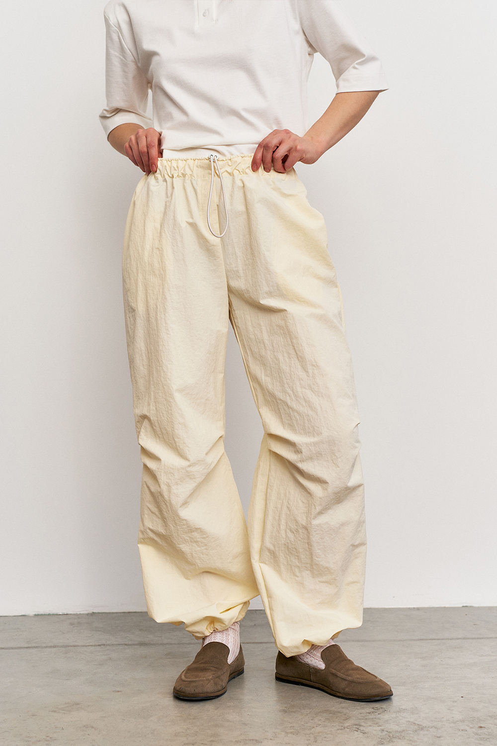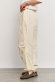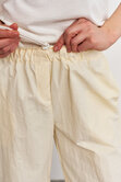 Объемные штаны с затяжками по низу, что позволяет регулировать их длину, тем самым подстраиваясь под рост и предпочтения в носке. Затяжки в поясе так же способствуют регулированию посадки по талии или бёдрам.