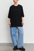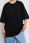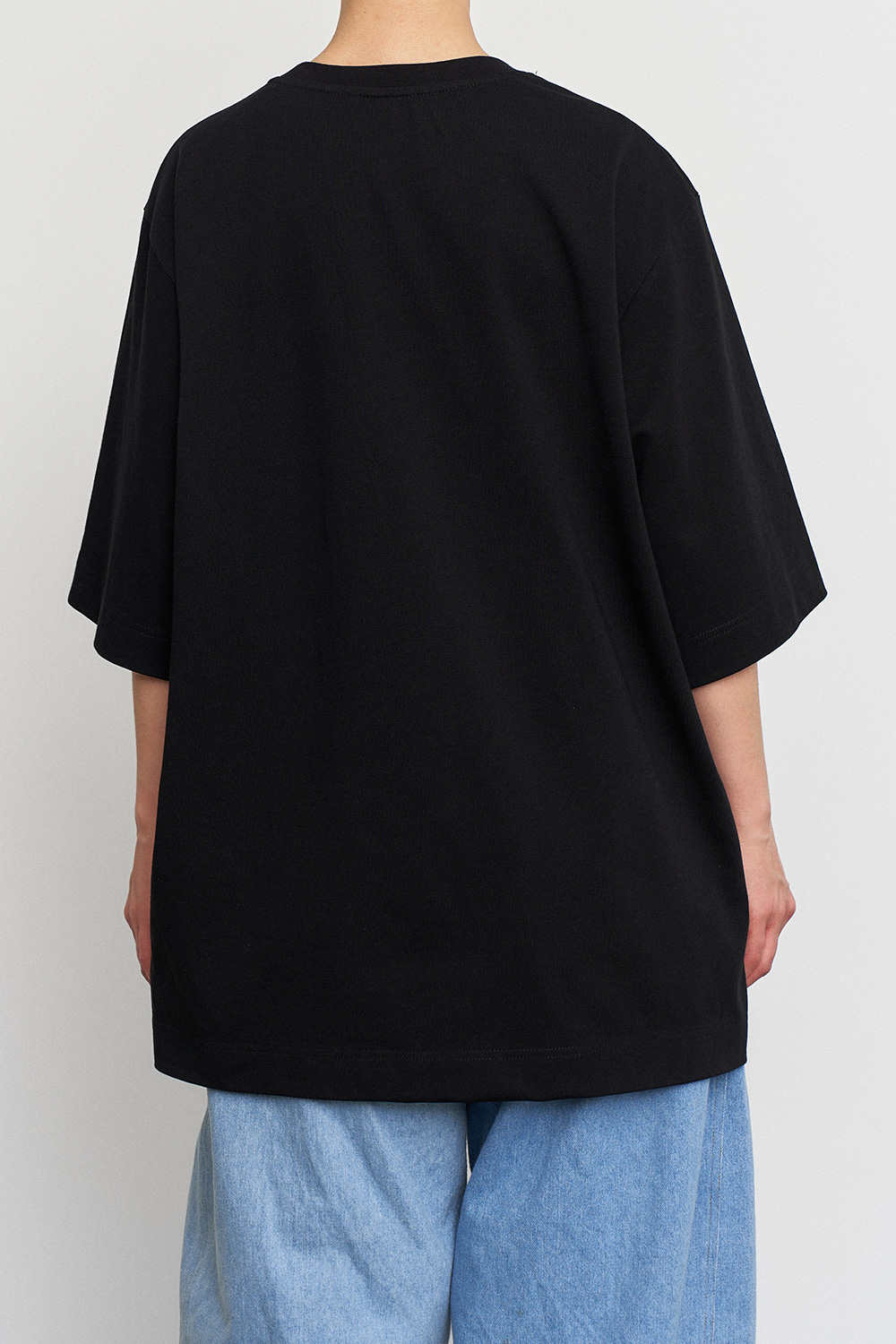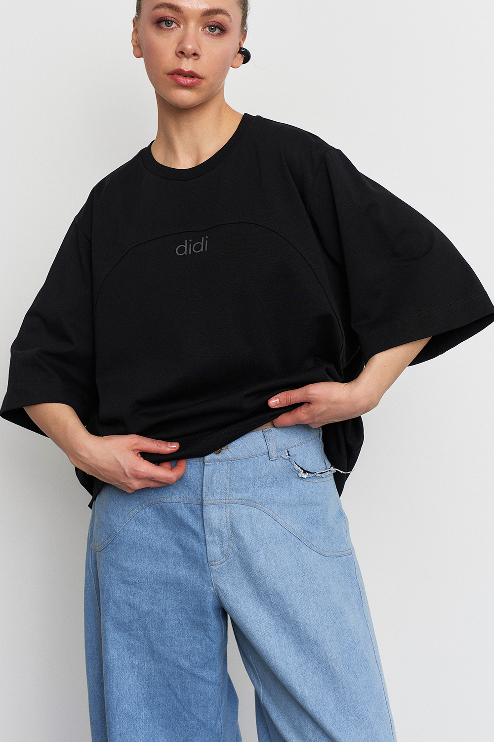 Объемная удлиненная футболка из плотного хлопка с акцентной линией спереди. Идеальный вариант для повседневных образов с джинсами, юбками или костюмом.