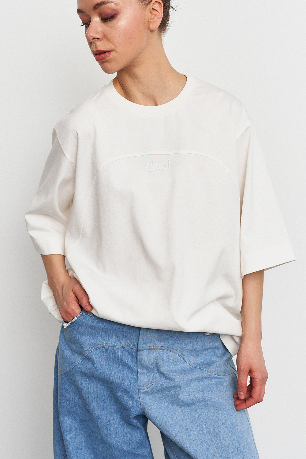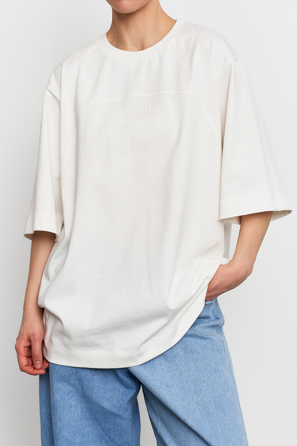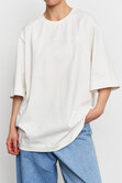 Объемная удлиненная футболка из плотного хлопка с акцентной линией спереди. Идеальный вариант для повседневных образов с джинсами, юбками или костюмом.