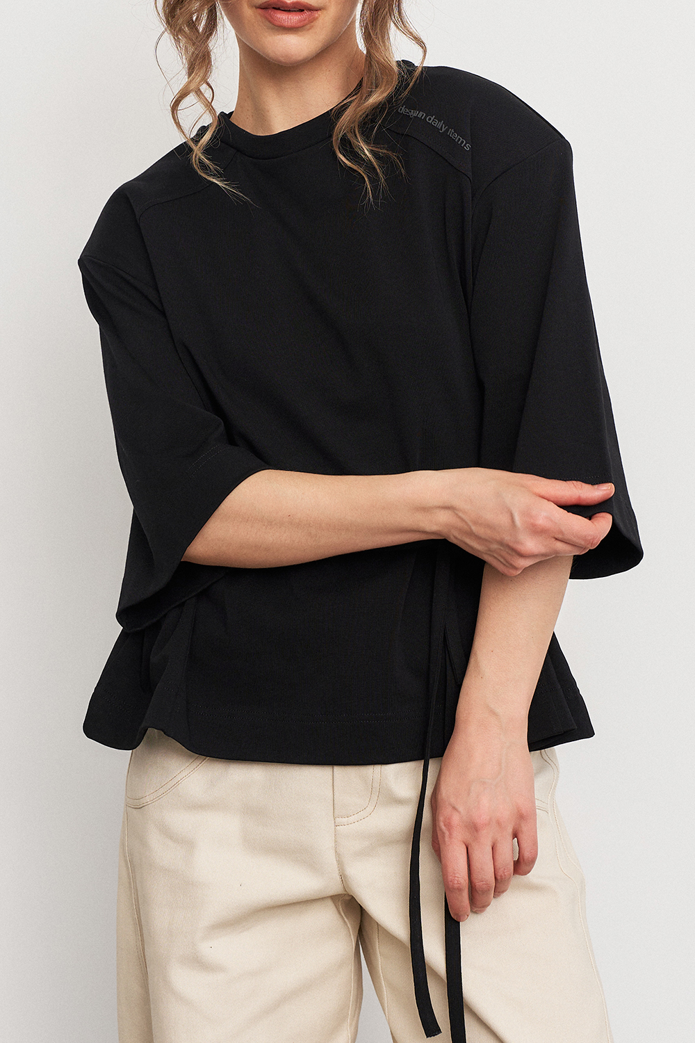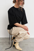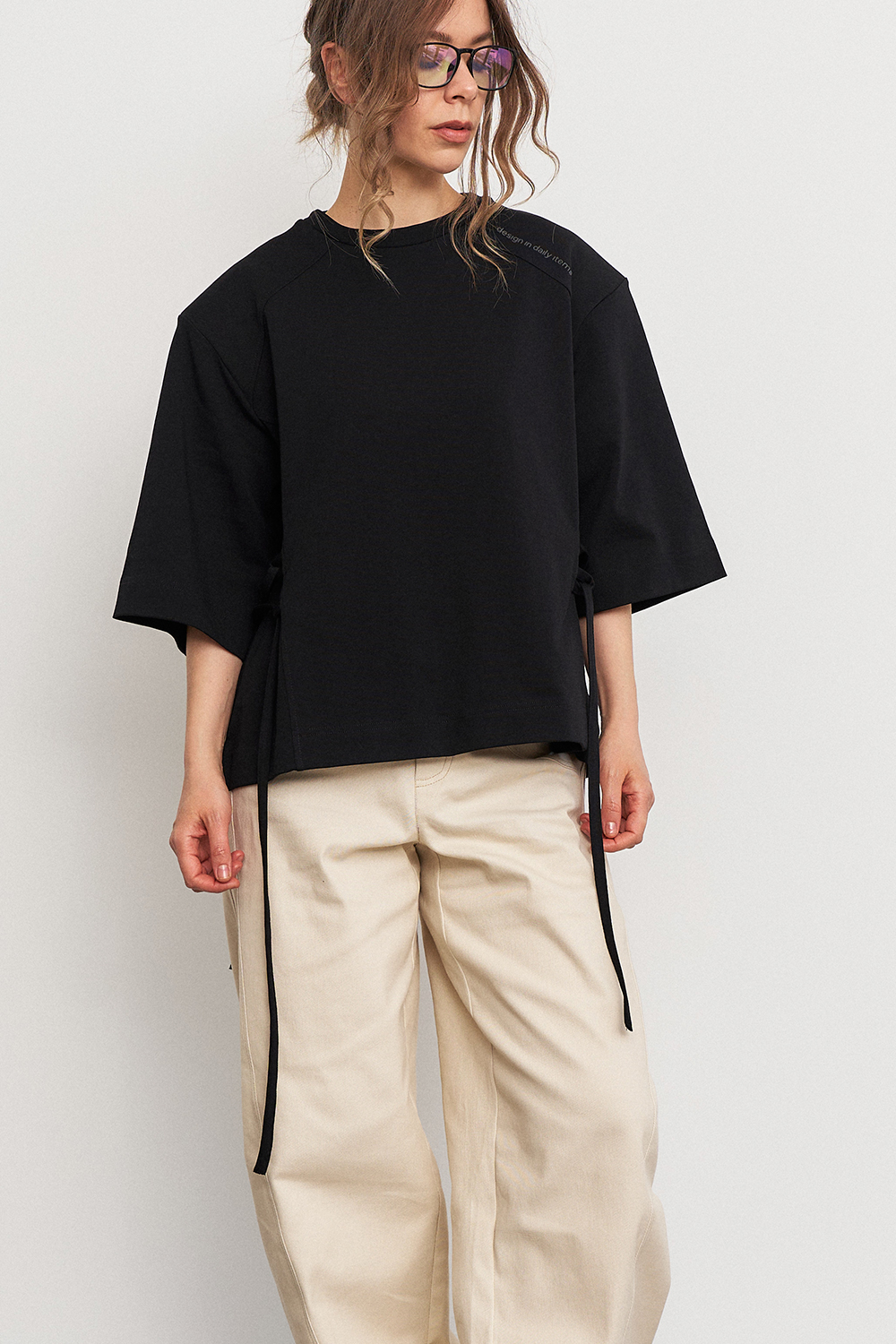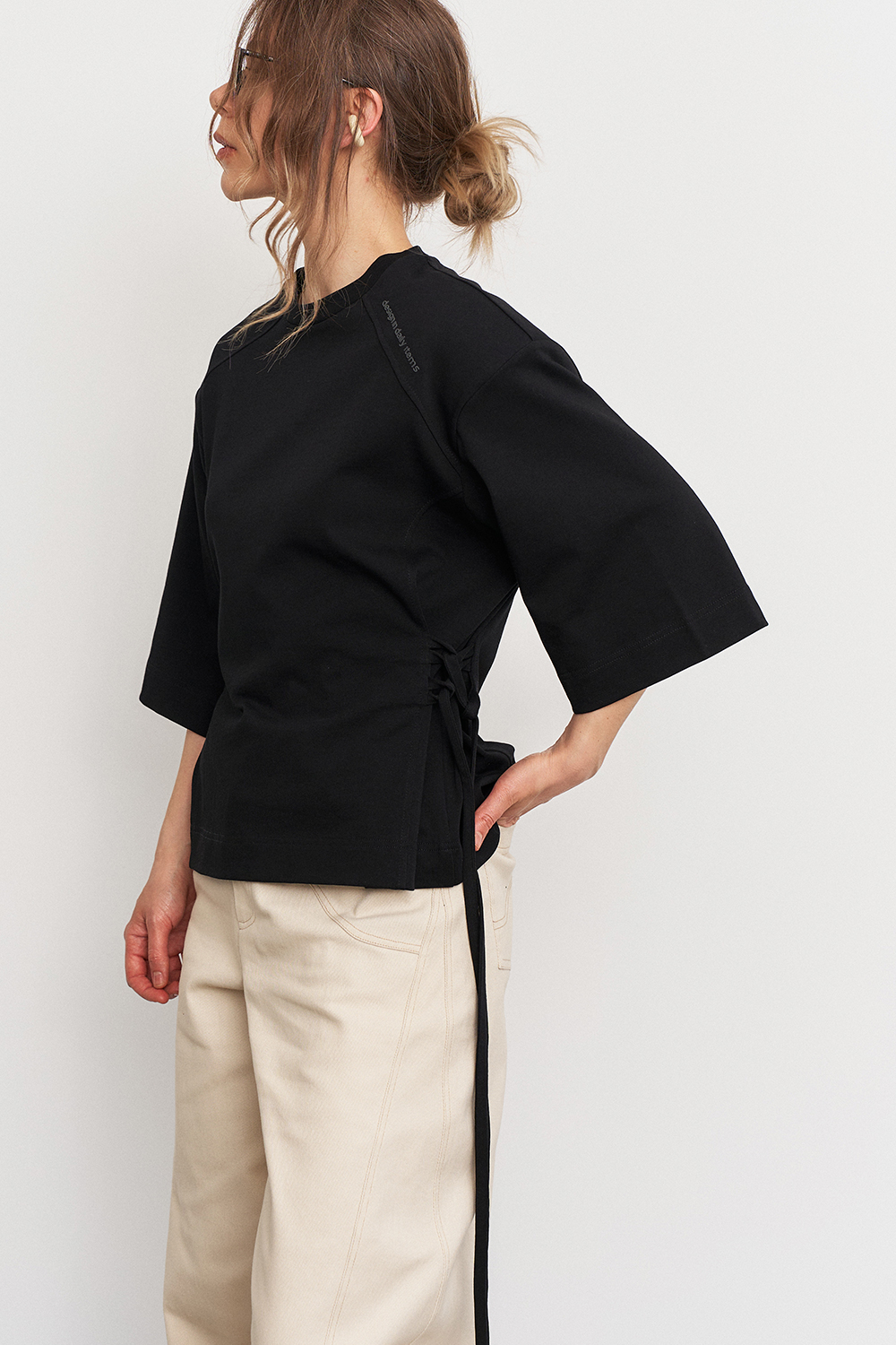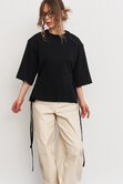 Футболка с объемной плечевой линией в едином размере, за счет шнуровки по бокам можно регулировать посадку - от свободной до подчеркнутой, либо же и вовсе менять образ.
