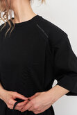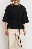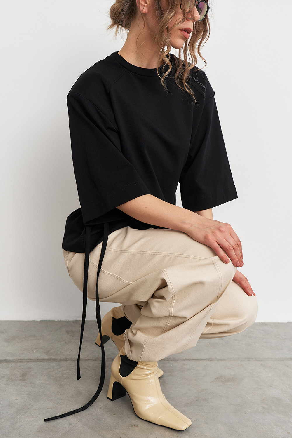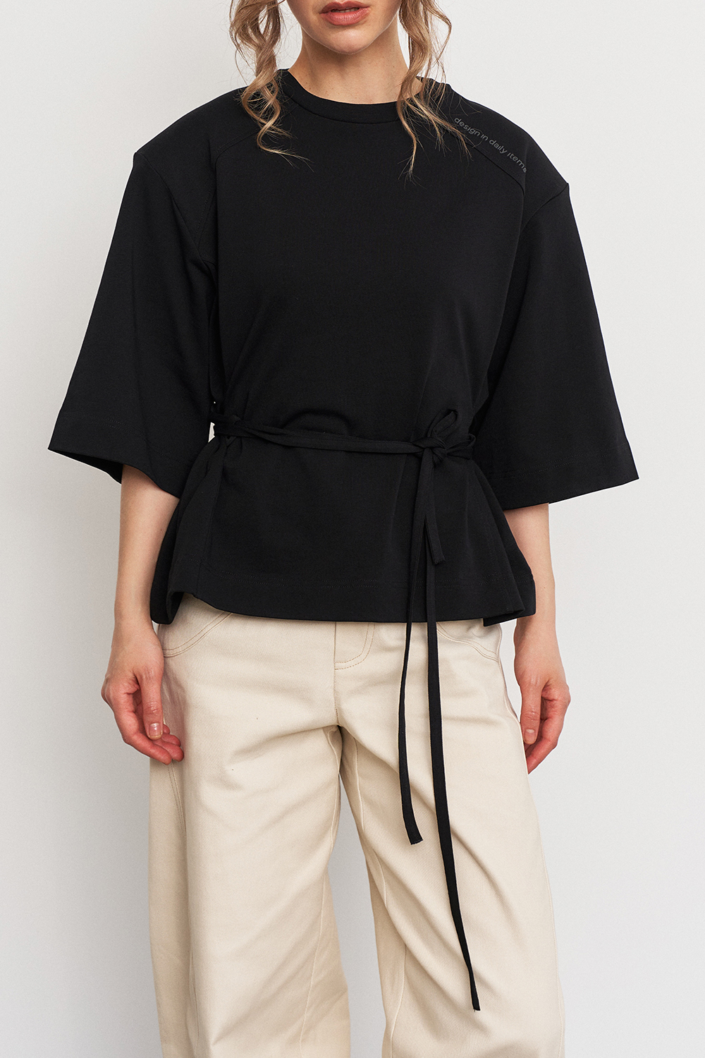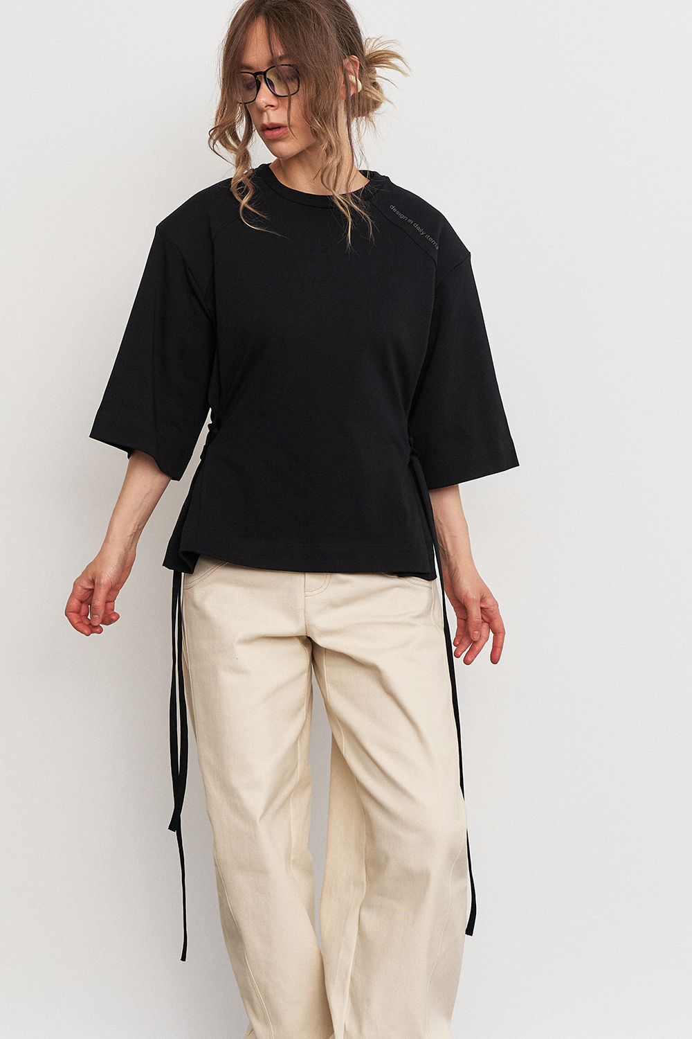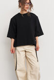 Футболка с объемной плечевой линией в едином размере, за счет шнуровки по бокам можно регулировать посадку - от свободной до подчеркнутой, либо же и вовсе менять образ.