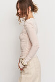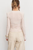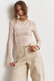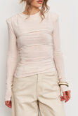 Лонгслив прилегающего кроя с акцентной линией плеч и мягкой драпировкой по всей длине выгодно подчеркивает силуэт и добавляет образу выразительности, оставаясь при этом комфортным на каждый день.