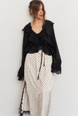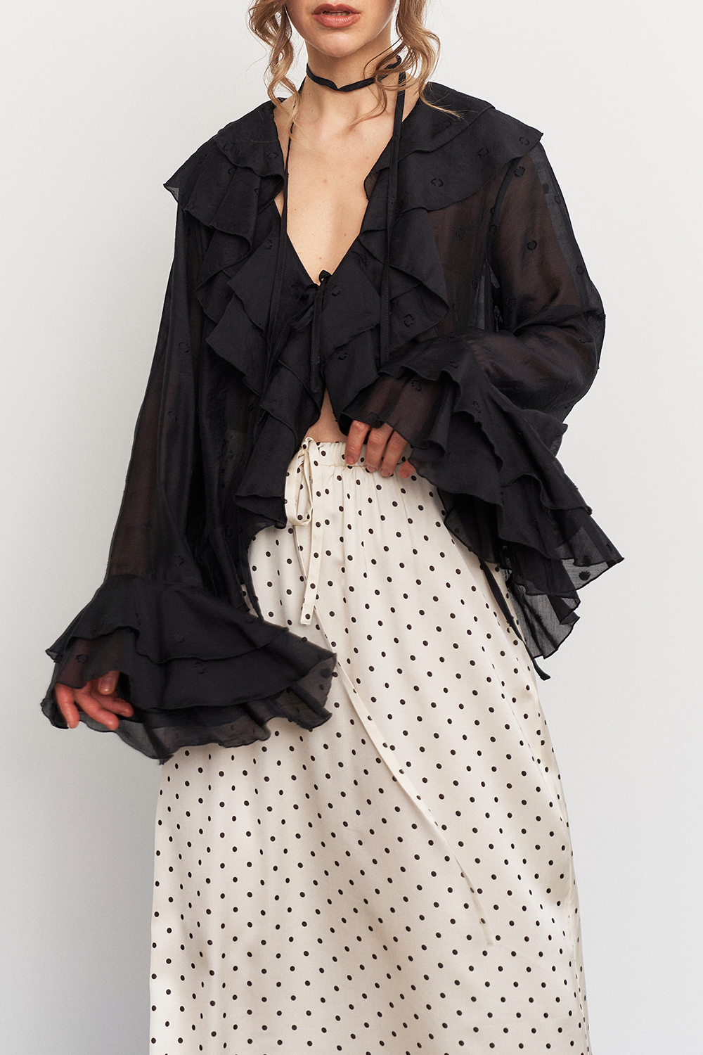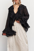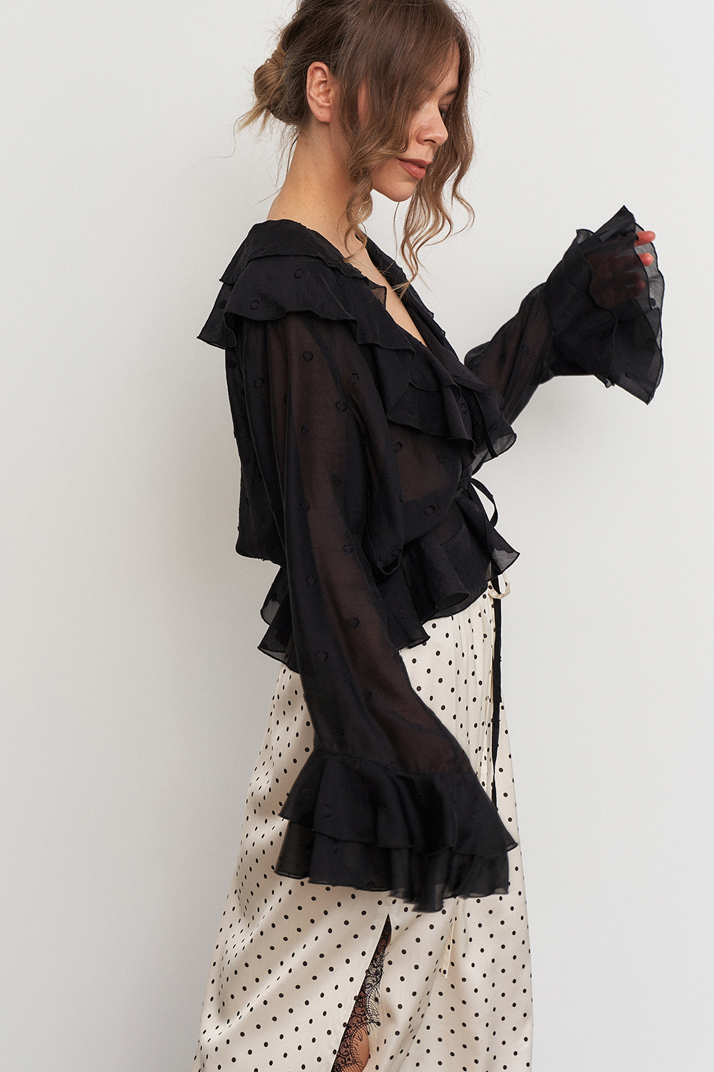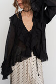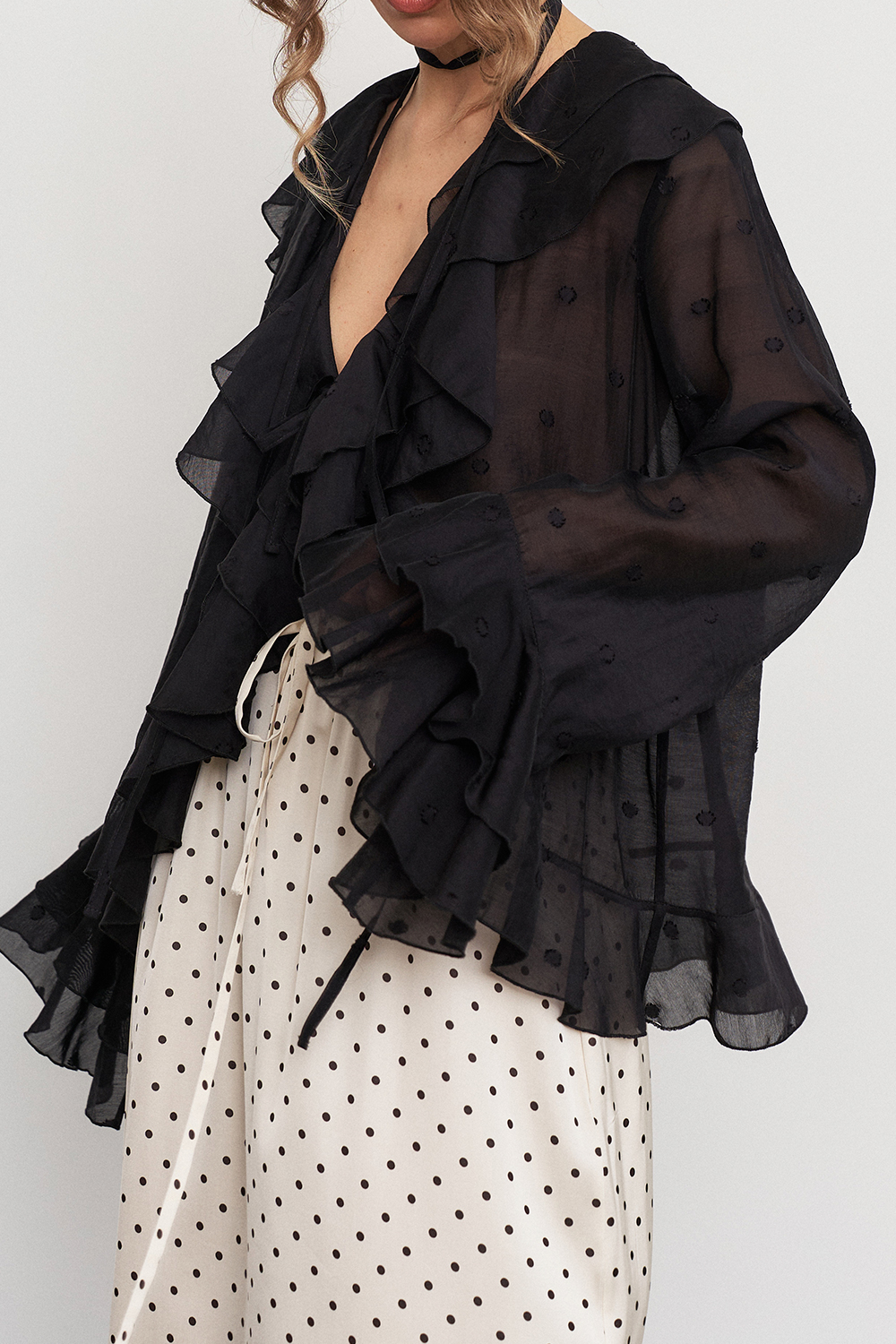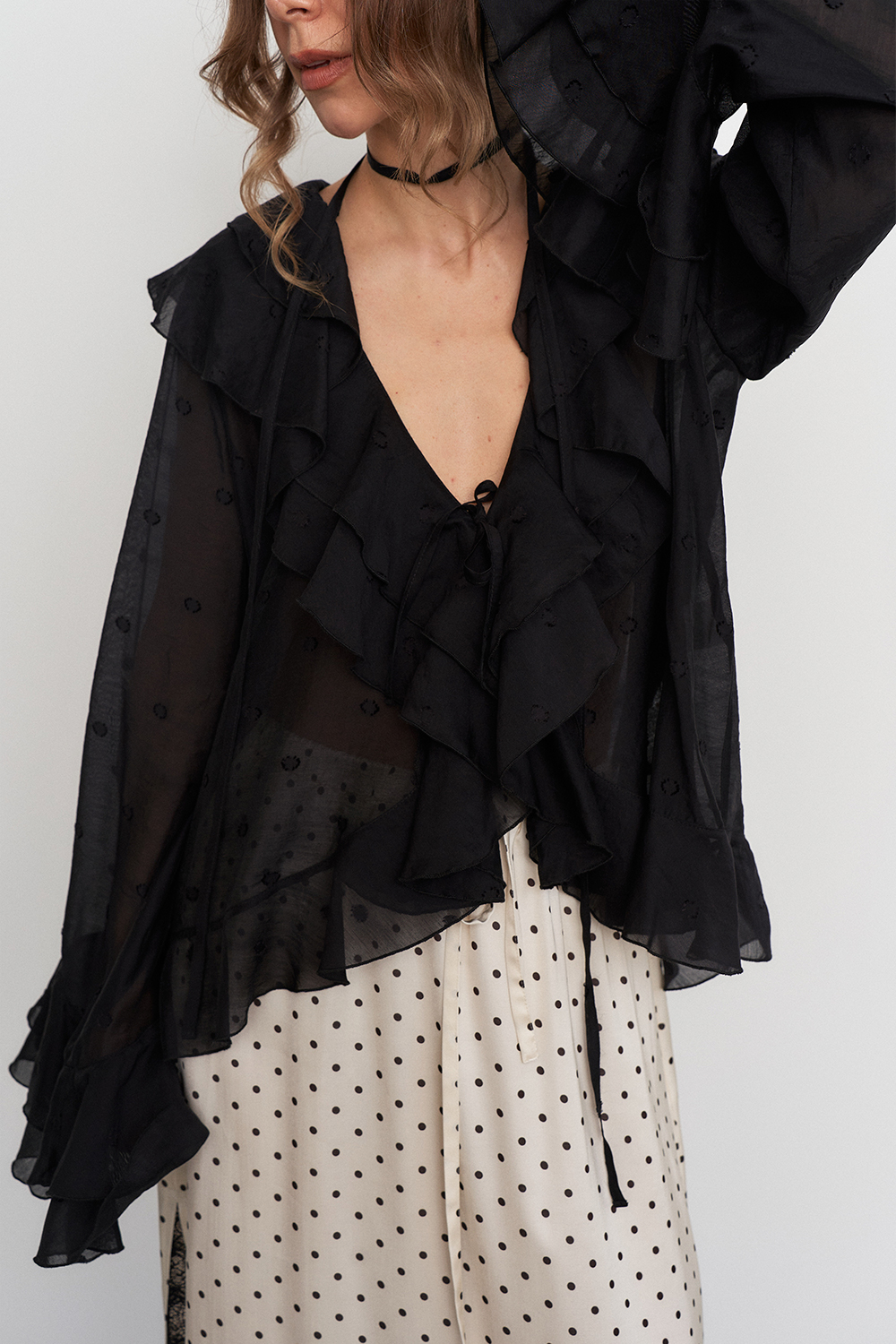Блуза с глубоким V-образым вырезом, объемными рукавами и романтичными воланами, дополнена универсальным поясом-шнурком, который можно завязывать на талию или носить в виде чокера на шее.