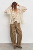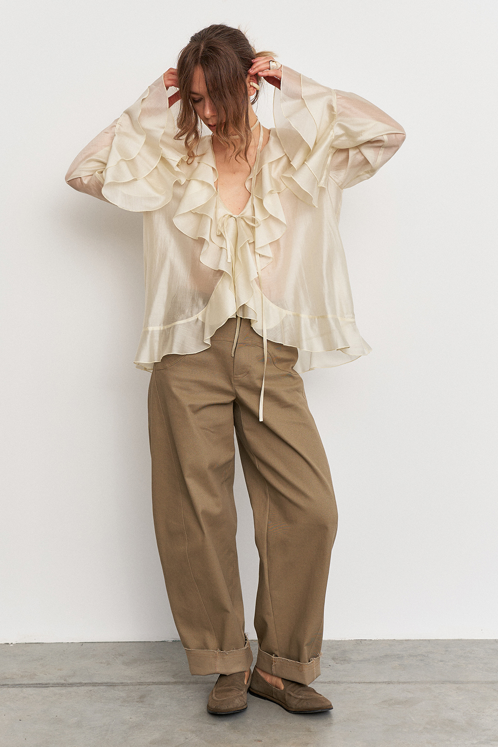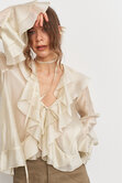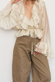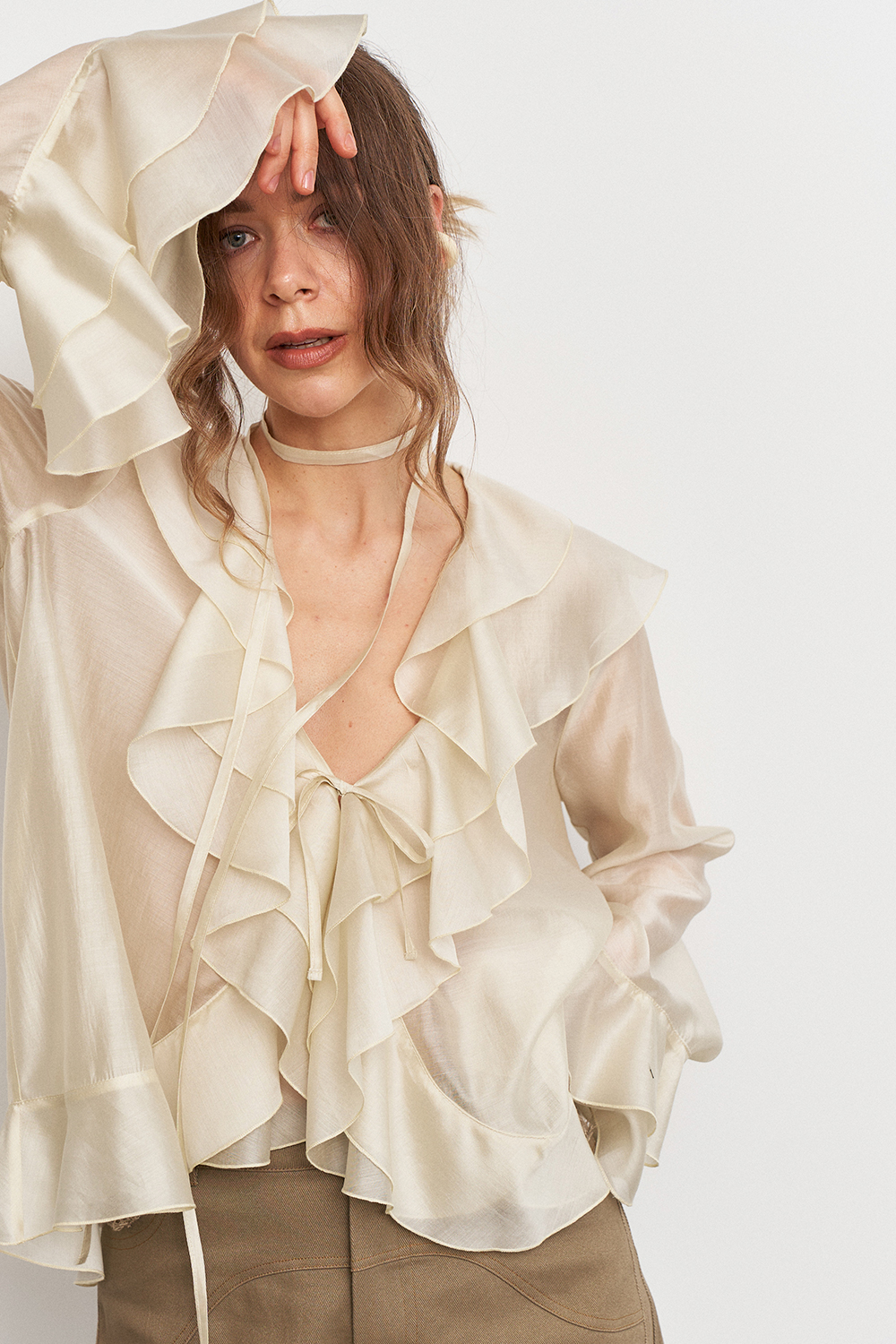 Блуза с глубоким V-образым вырезом, объемными рукавами и романтичными воланами, дополнена универсальным поясом-шнурком, который можно завязывать на талию или носить в виде чокера на шее.