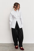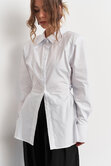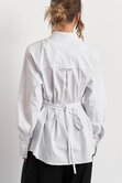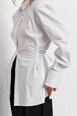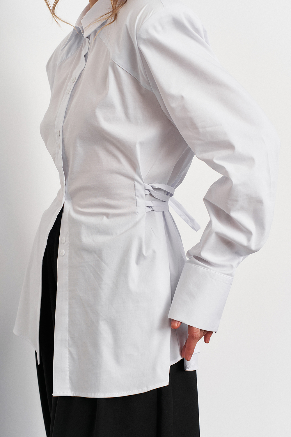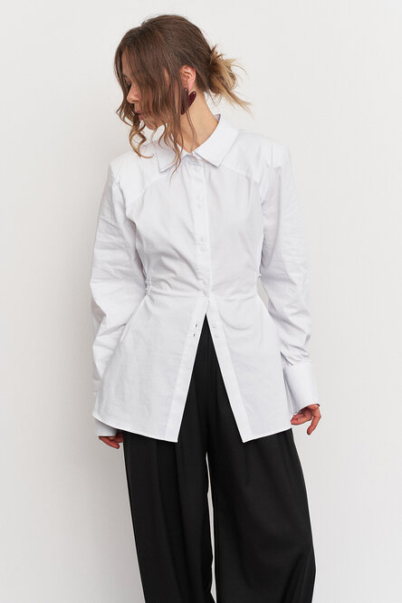 Рубашка с акцентной плечевой линией в едином размере, за счет шнуровки на спинке можно регулировать степень приталивания, делая образ более силуэтным.