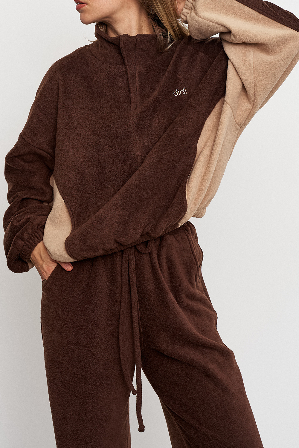 Олимпийка свободного кроя с замком и резинкой по низу, что позволяет делать силуэт более объемным. Карманы с листочкой добавляют олимпийке удобства и визуальной сложности, делая ее интереснее.