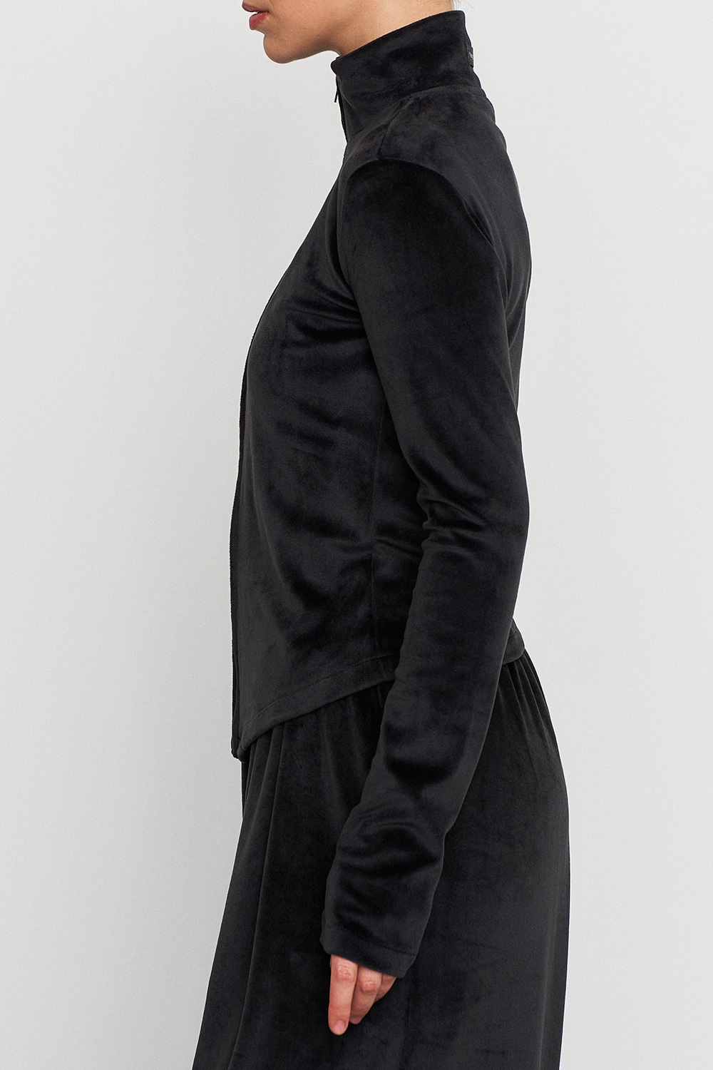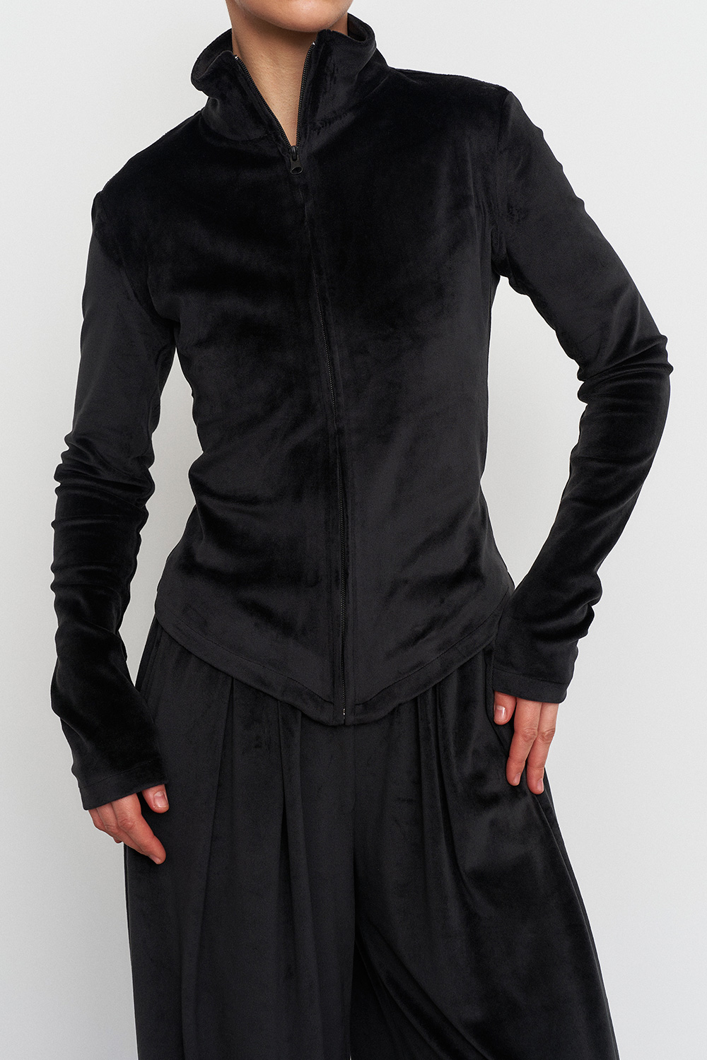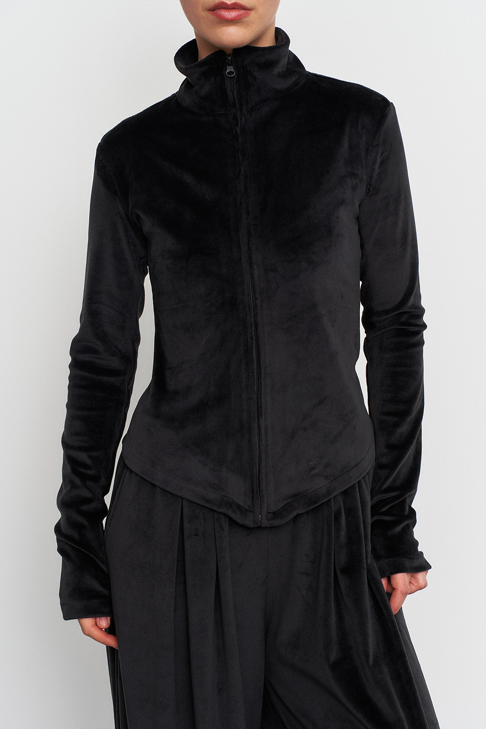 Приталенная олимпийка с удлиненным кроем спереди, формирующая красивый акцентный силуэт, а ткань и посадка - обеспечивают комфорт в движении.