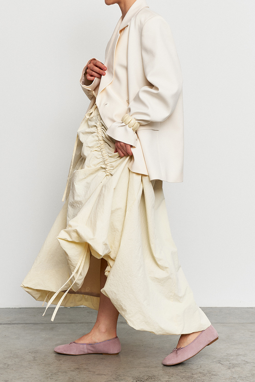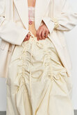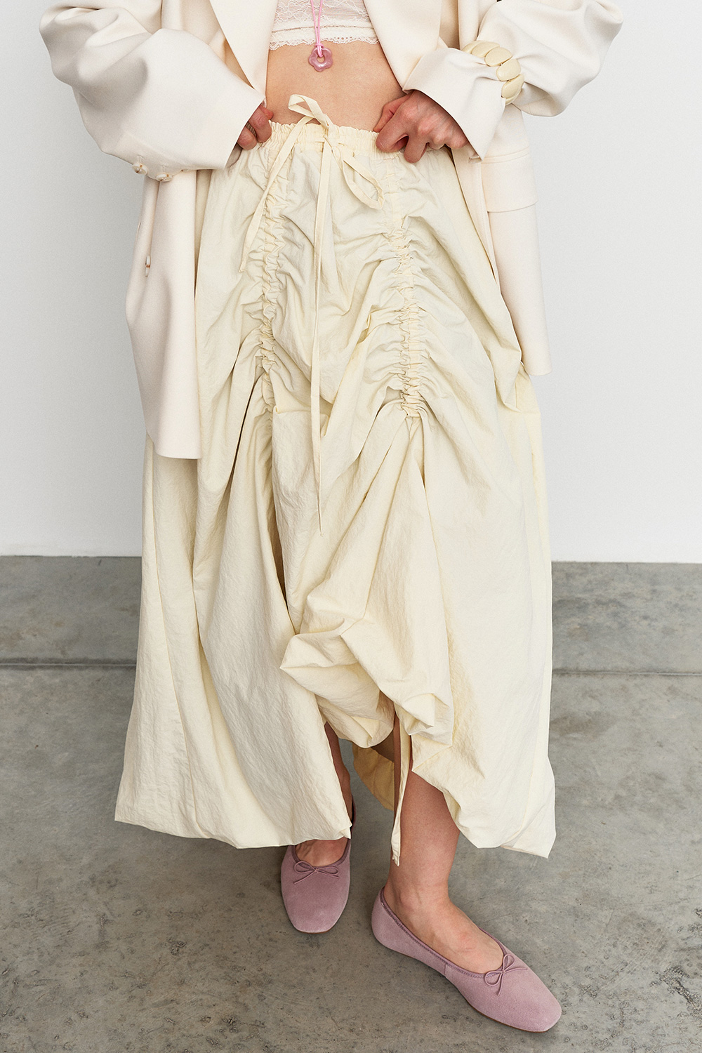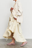 Акцентная юбка с регулируемой длиной спереди с помощью затяжек, а так же резинкой на талии. Модель с эффектом сборок создает объемный, женственный силуэт, идеально подходящий как для повседневных образов, так и для особенных случаев.