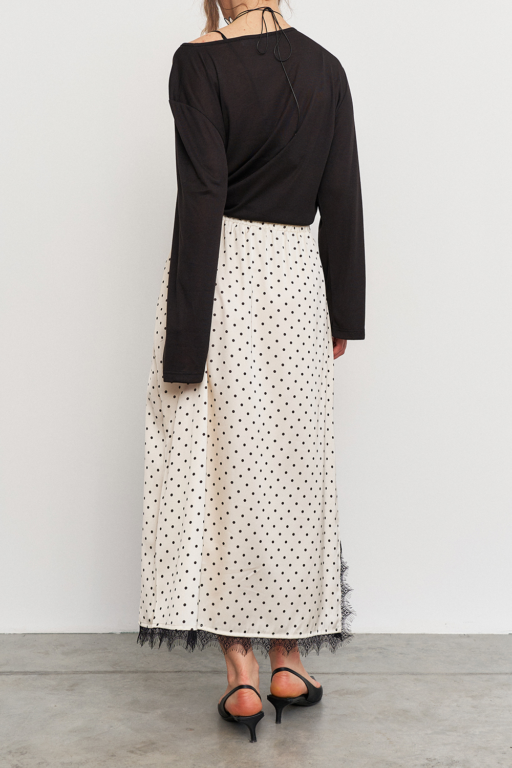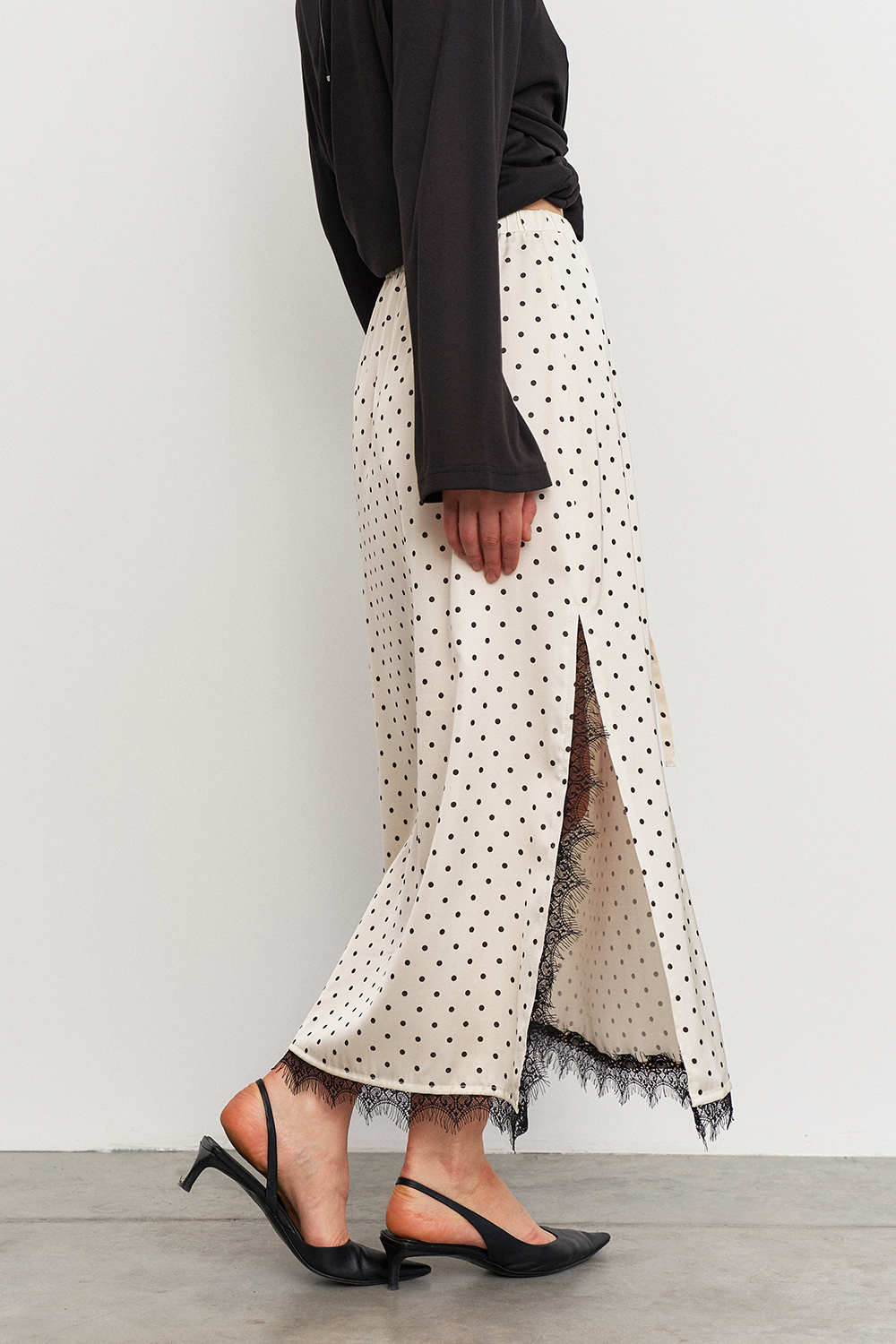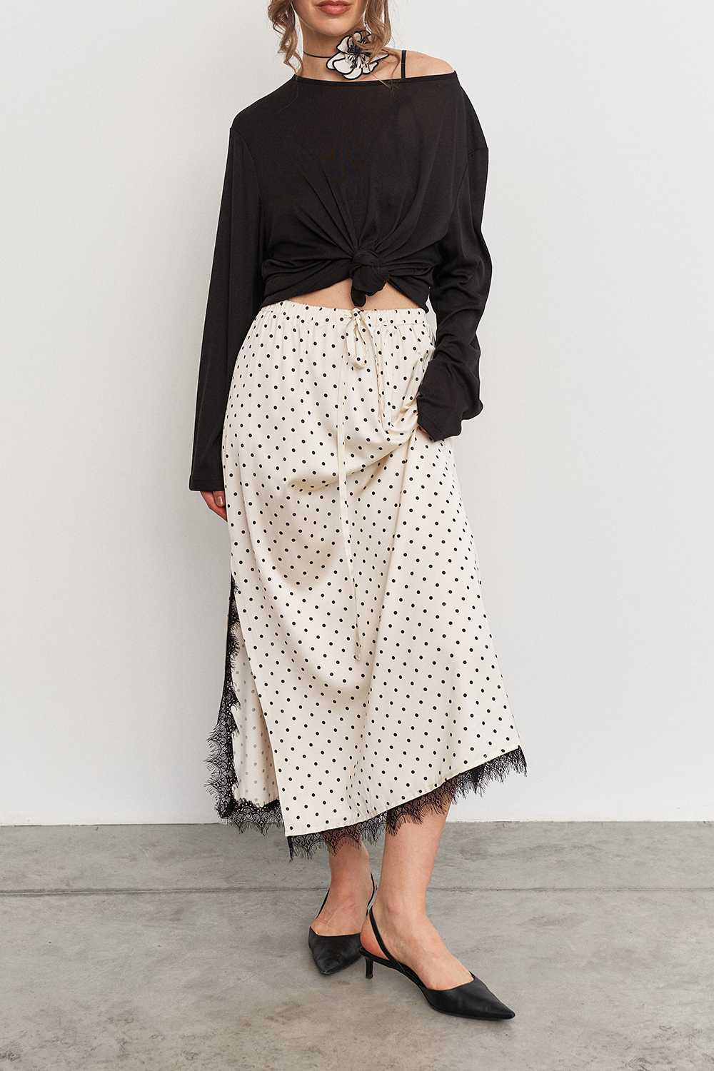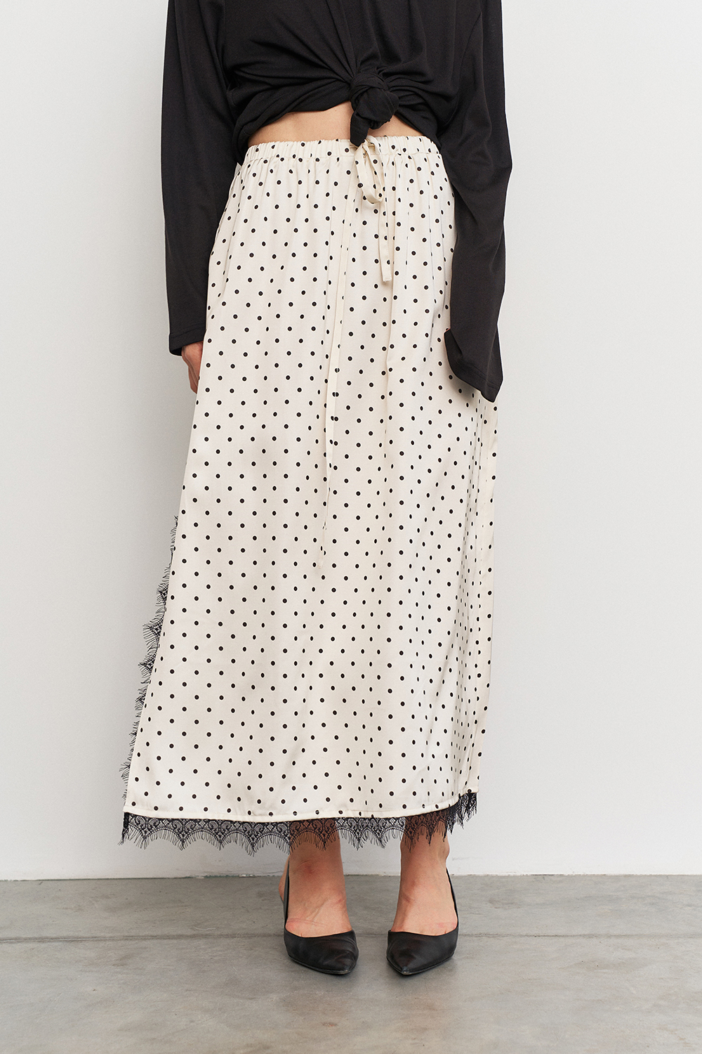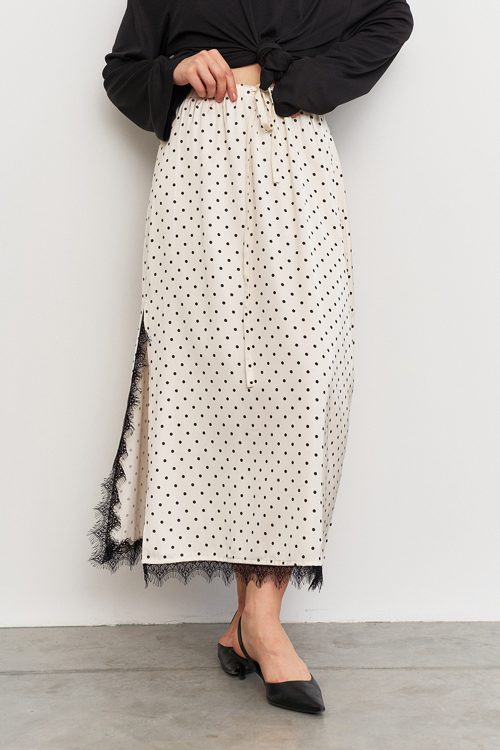 Юбка с изящным разрезом, украшенная кружевом по внутренней стороне, отличается удобной посадкой благодаря резинке с кулиской на талии. Она подчеркивает женственные линии и подходят для повседневных или вечерних образов.