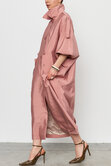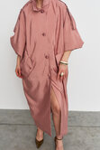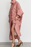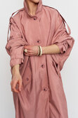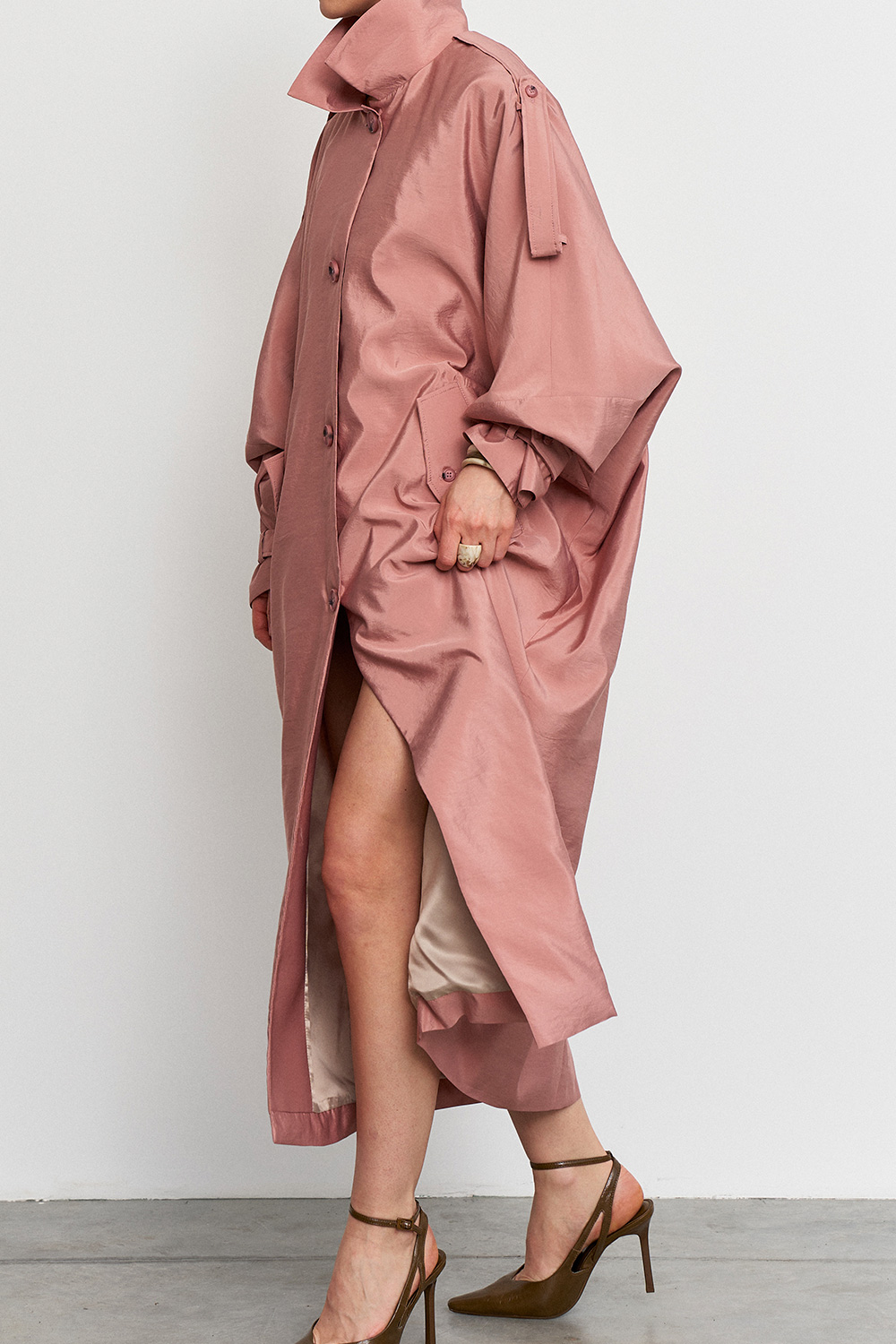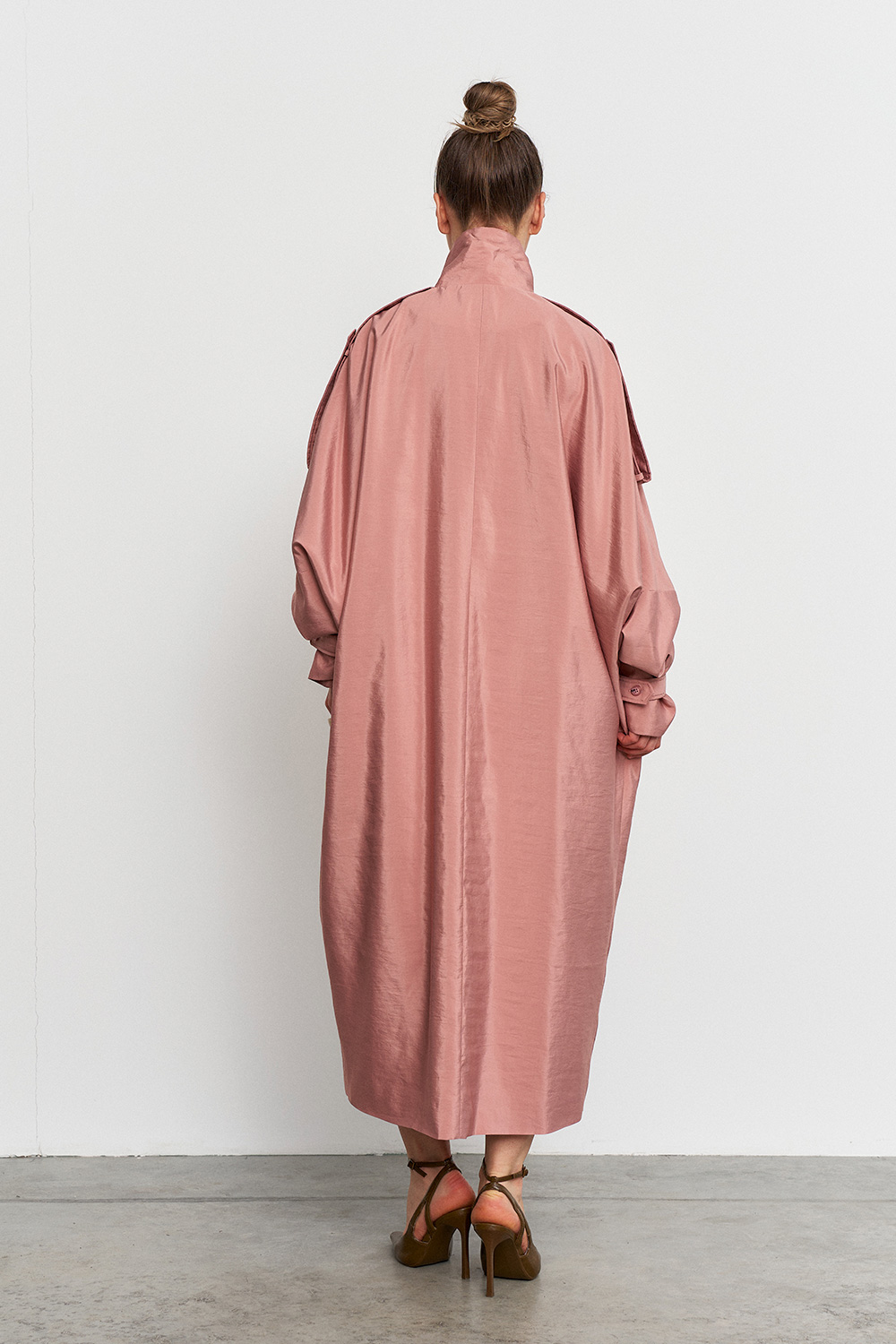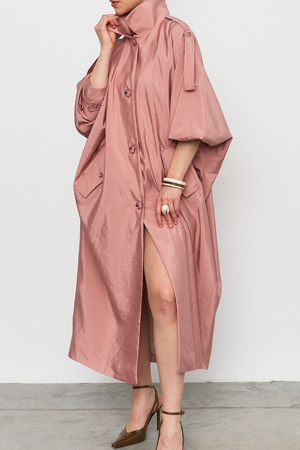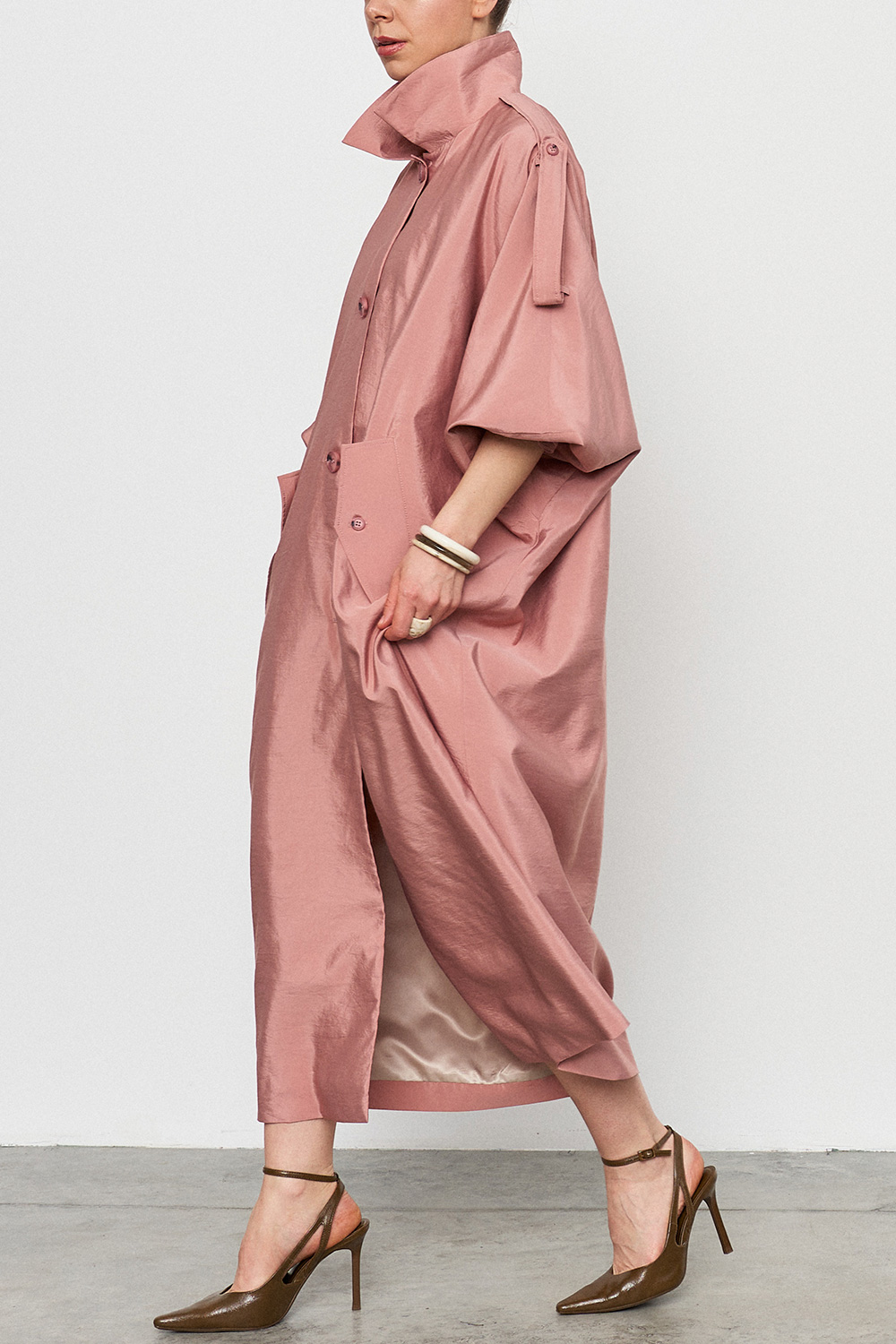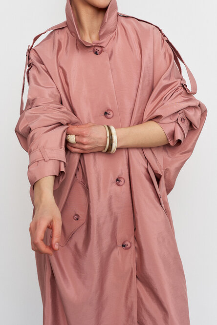 Объемный плащ, интересной формы, с патами на плечах и рукавах, которые можно застегивать по-разному, придавая плащу новые формы. Отложной воротник плотно продублирован, поэтому легко превращается в ворот-стойку, а функционирующие карманы находятся под акцентными клапанами. Черный, молочный и оливковый - с влагоотталкивающей пропиткой, розовый - без, облегченный, легкий и воздушный.