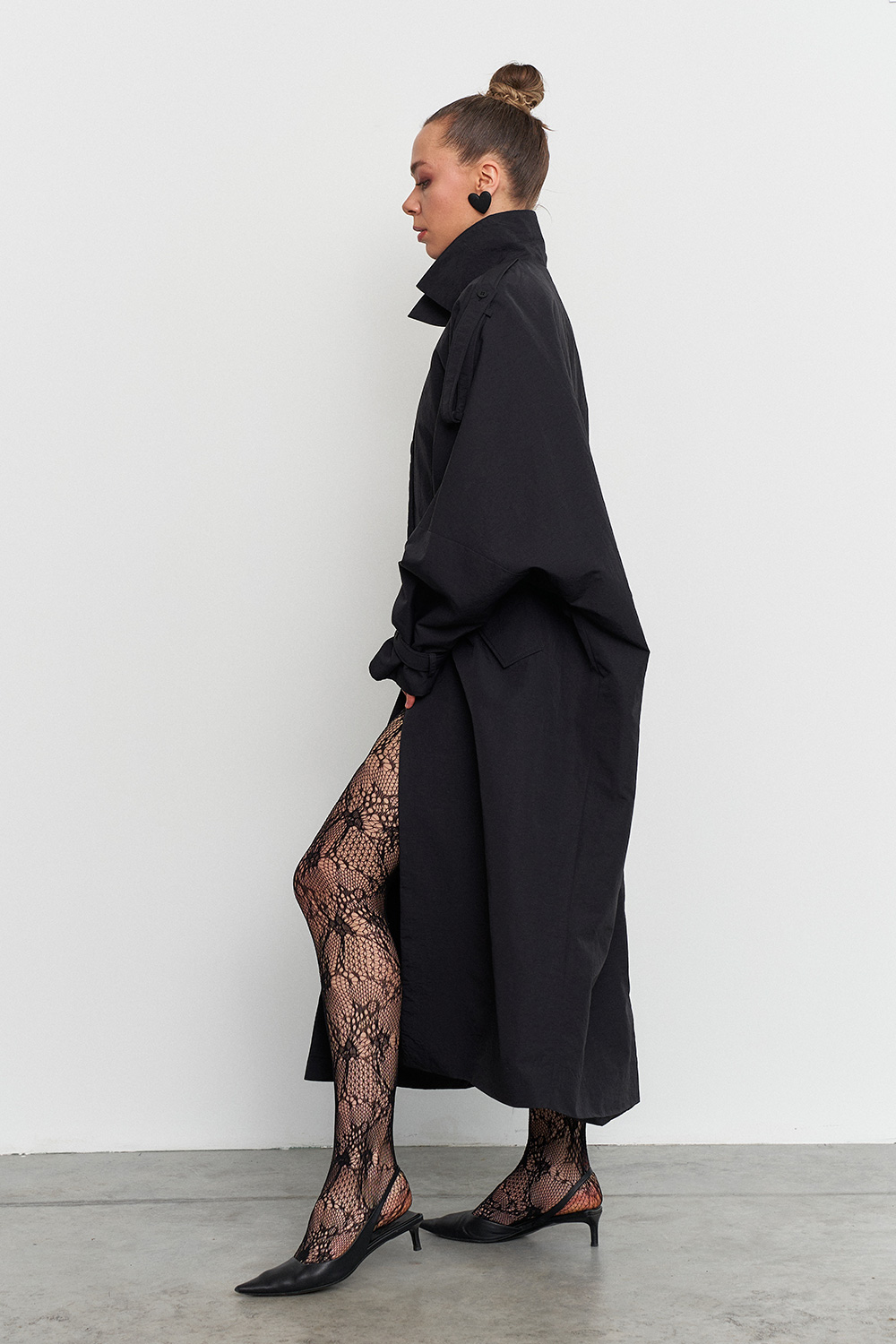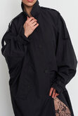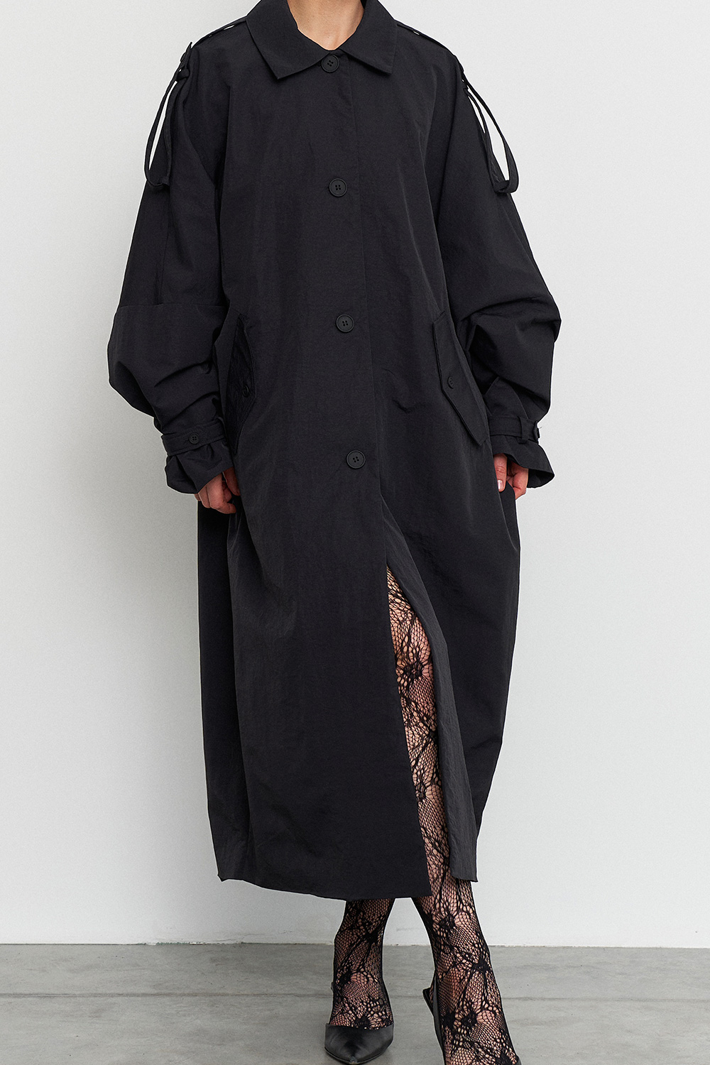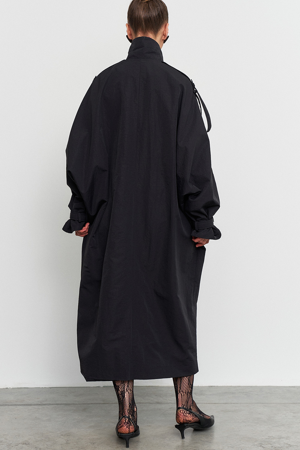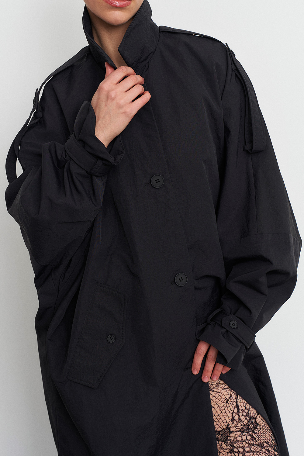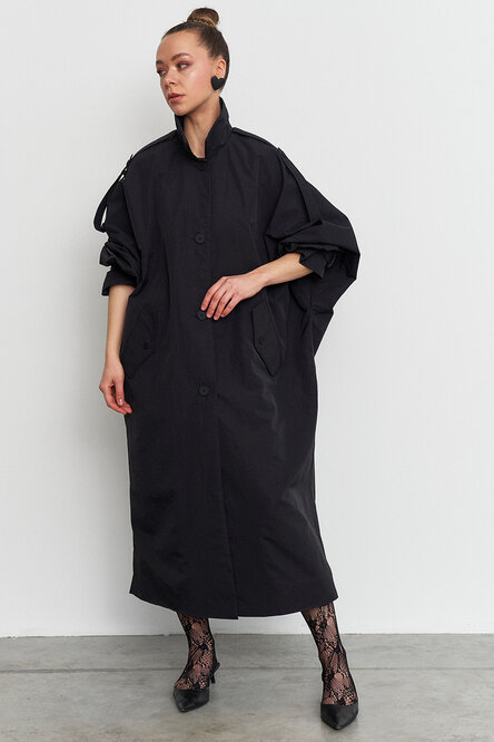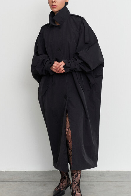 Объемный плащ, интересной формы, с патами на плечах и рукавах, которые можно застегивать по-разному, придавая плащу новые формы. Отложной воротник плотно продублирован, поэтому легко превращается в ворот-стойку, а функционирующие карманы находятся под акцентными клапанами. Черный, молочный и оливковый - с влагоотталкивающей пропиткой, розовый - без, облегченный, легкий и воздушный.