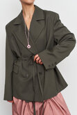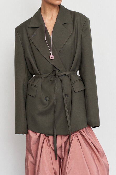 Классический жакет в едином размере, который имеет довольно большой оверсайз. В комлекте идет пояс, чтобы вы могли создавать приталенный силуэт, а так же носить на шее, как галстук.