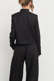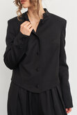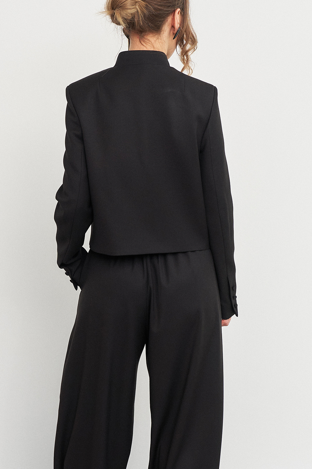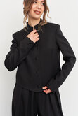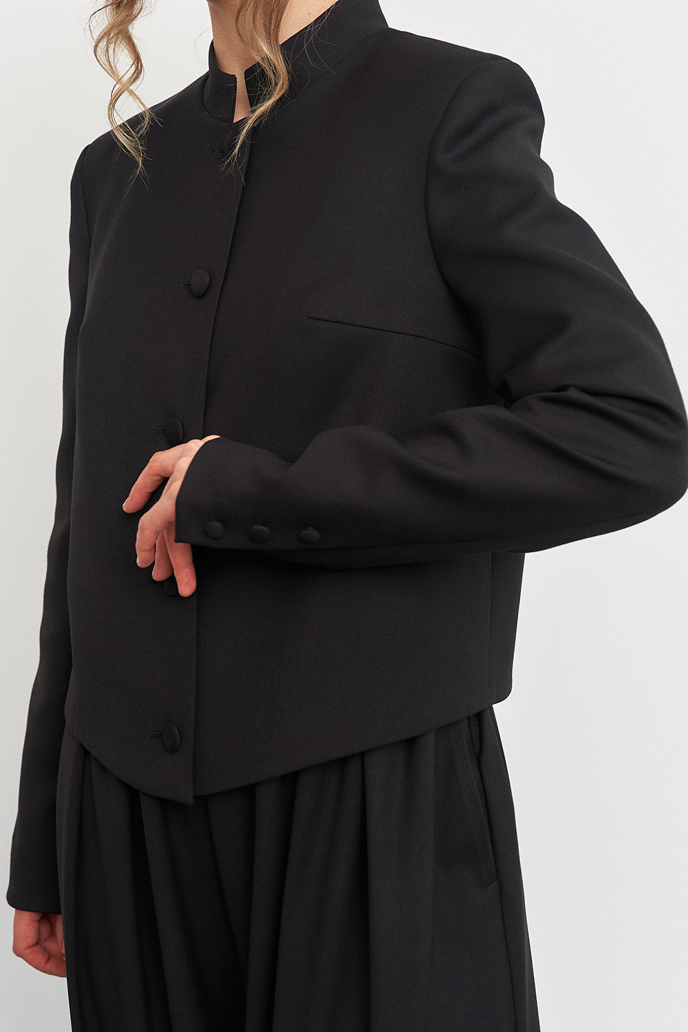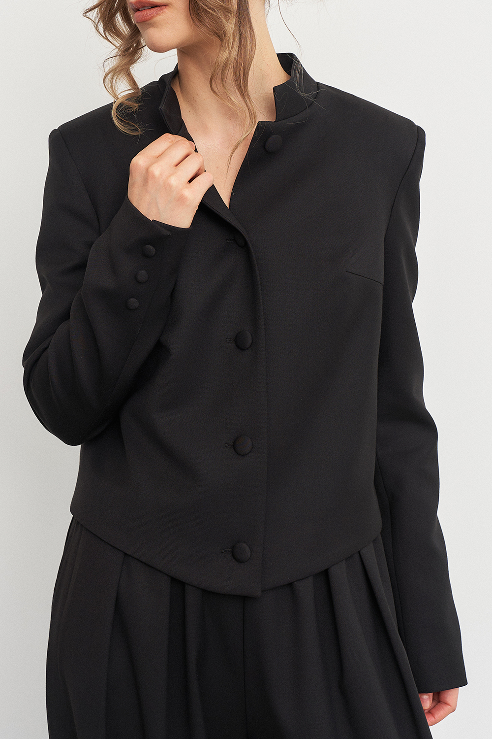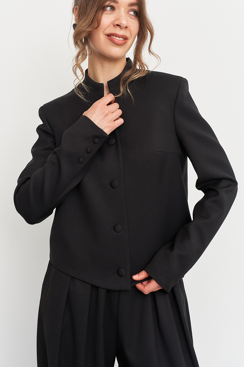 Укороченный жакет с приталенным кроем красиво облегает фигуру, подчеркивая женственные контуры, а воротник-стойка добавляет образу строгих линий, делая его более эффектным.